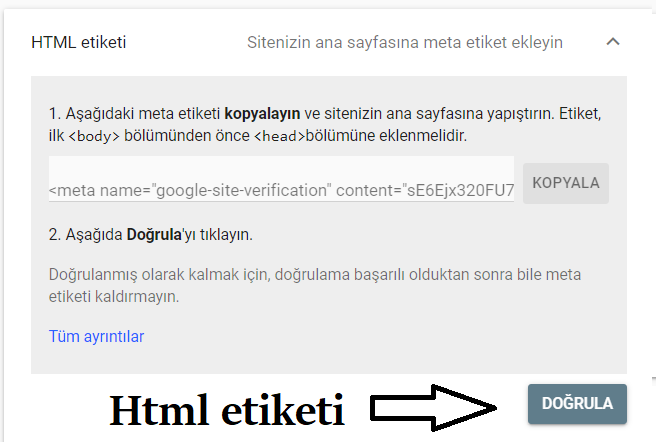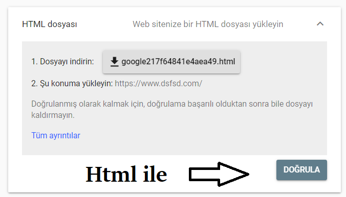 Html ile doğrulama ftp ile ya da dosya yöneticinize giderek bu dosyayı ana dizininize ekleyerek doğrulama yapınız. Hata ile karşılaşırsanız. Dosya yeriniz ya da Dosya izinlerini vermemiş olabilirsiniz.